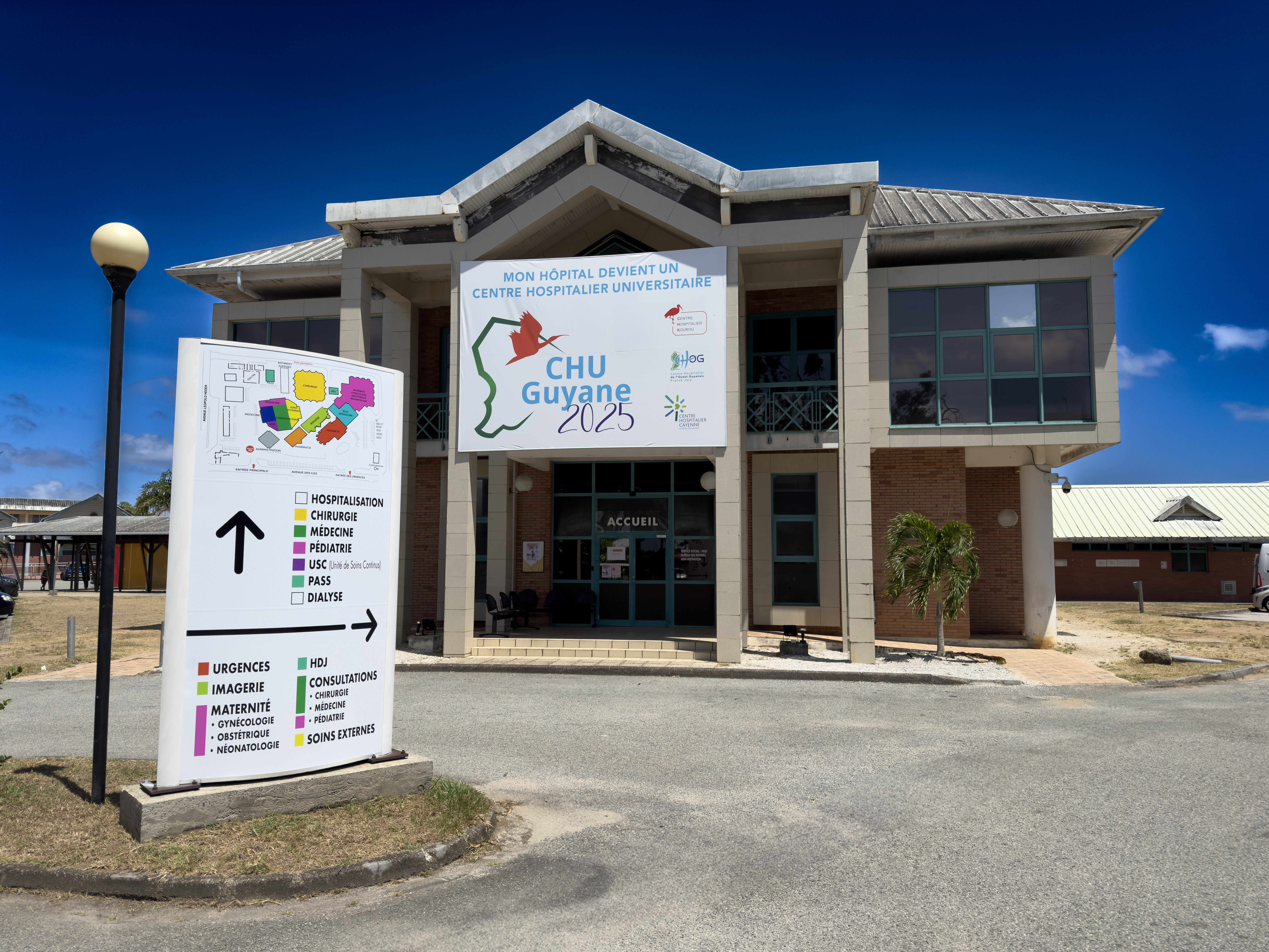 Le Centre Hospitalier Universitaire de Guyane site de Kourou, hôpital public, se situe dans la ville spatiale de Kourou, à 60 km de Cayenne. Avec une capacité d’une centaine de lits et places, l'établissement assure une activité de court séjour en Médecine, Chirurgie, Obstétrique et néonatologie (niveau IIa).